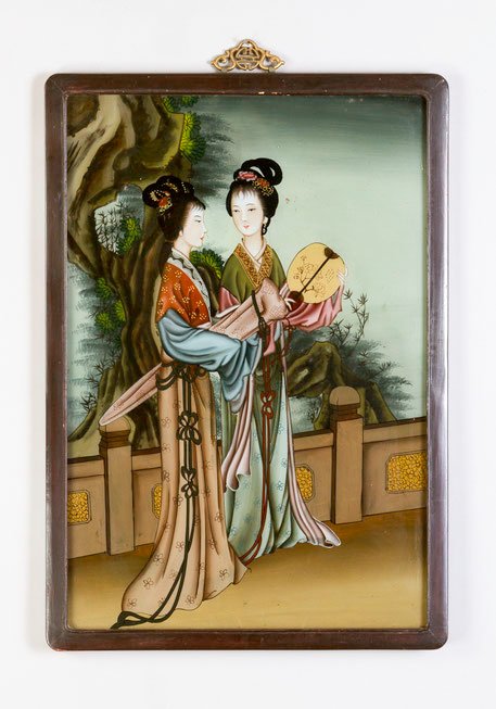 Feine Hinterglasmalerei in polychromen Farben, zarter Pinselstrich und in hervorragender Malqualität, die beiden Hofdamen in der Tracht und mit höfischen Frisuren der ausklingenden Qing-Dynastie in einem Palastgarten, in den Händen jeweils ein Fächer bzw. ein zusammengerollter Schirm, im Holzrahmen.