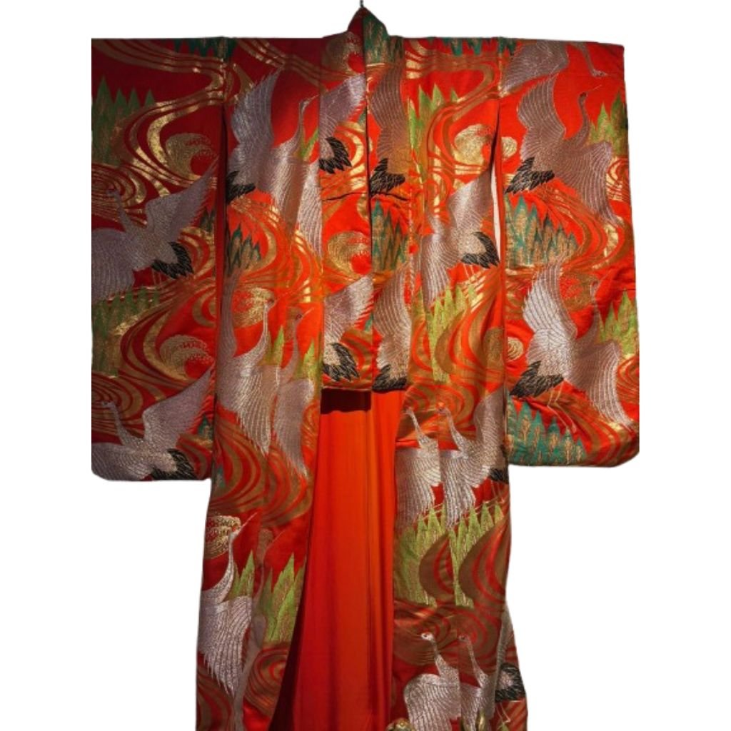 Wattierte, schwere Ausführung mit langen, weit ausladenden Ärmeln, typisch für repräsentative Zeremonial- oder Hochzeitskimonos (Uchikake). Innenfutter und Verarbeitung unterstreichen die hochwertige und monumentale Anmutung dieses Stücks.