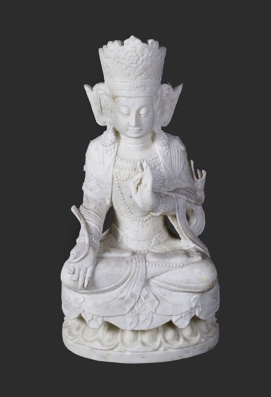 Weißer Marmor, die prachtvolle Gestalt der Muttergottheit sitzt aufrecht im Lotossitz auf gestuftem -thron, die Hände halten jeweils einen erblühten Lotos, die Finger mit symbolischer Haltung, das Haupt mit einer verzierten Bodhisattva-Krone geschmückt, ebenfalls reicher Ohr- und Brustschmuck, min. alte Fehlstellen, unbed. für den sonst guten Gesamteindruck.