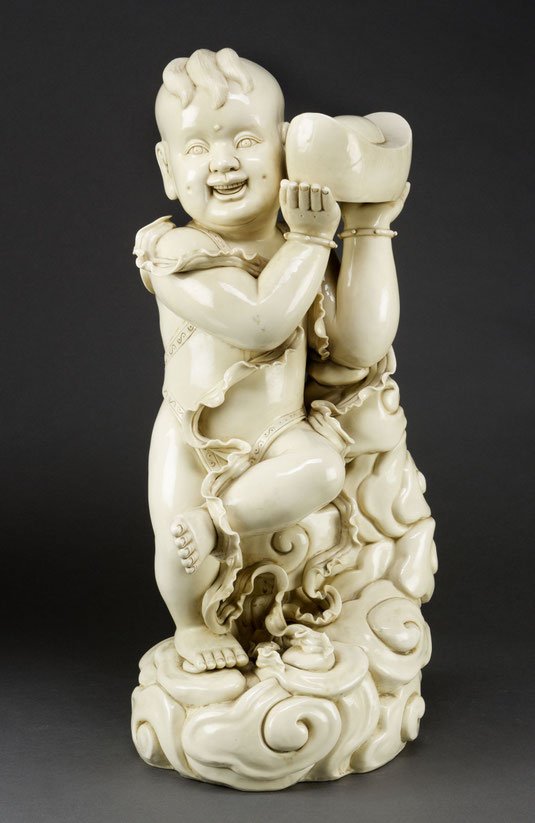 Feinporzellan Blanc-de-Chine, angelehnt an einen von stilisierten Wolken umgebenen Sockel hält der freundlich lächelnde Knabe einen mächtigen Edelmetallbarren mit beiden Händen, erträgt ein eng anliegendes Trikot und ist von plastischen Bändern umgeben, rückseitig eingeprägte Fischer- und Kalebassenmarke, glück- und reichtumverheißendes Geschenk anlässlich des asiat. Neujahrsfestes.