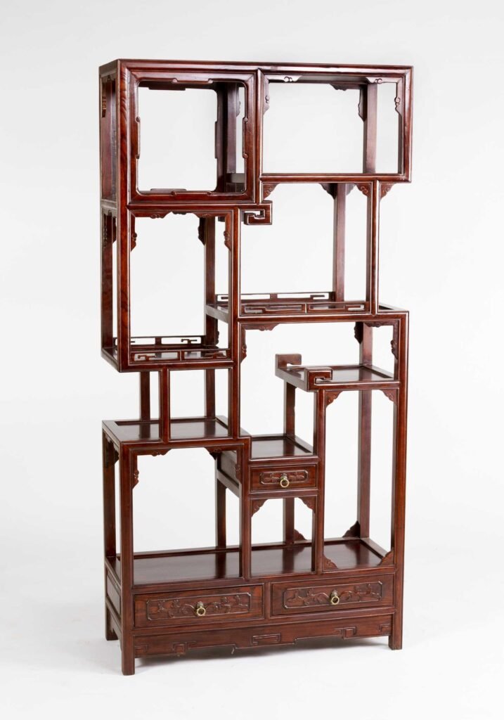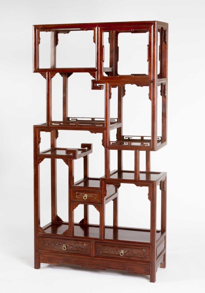 Dunkelbraunes, trop. Edelholz, in einem stabilen Rahmen eingebettet zahlreiche, nach allen Seiten offene, gestufte Etagen zur Aufnahme von Kuriositäten, Kleinkunstwerken, Büchern, etc., in einigen Ecken Zierelemente, 3 kleine Laden, verzierte Sockelleiste.