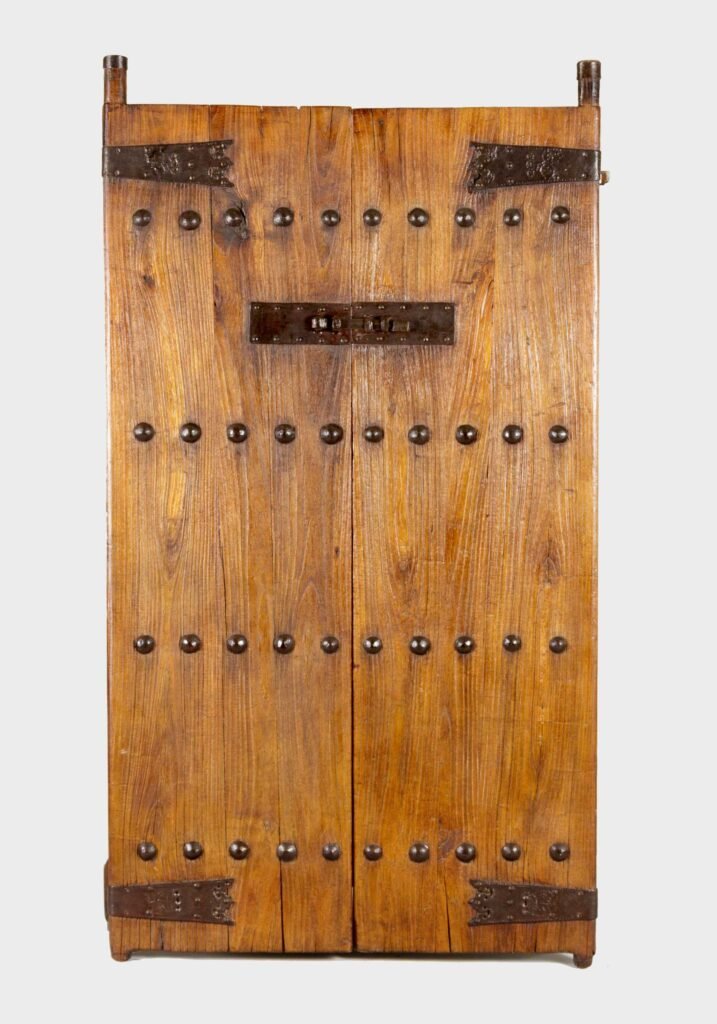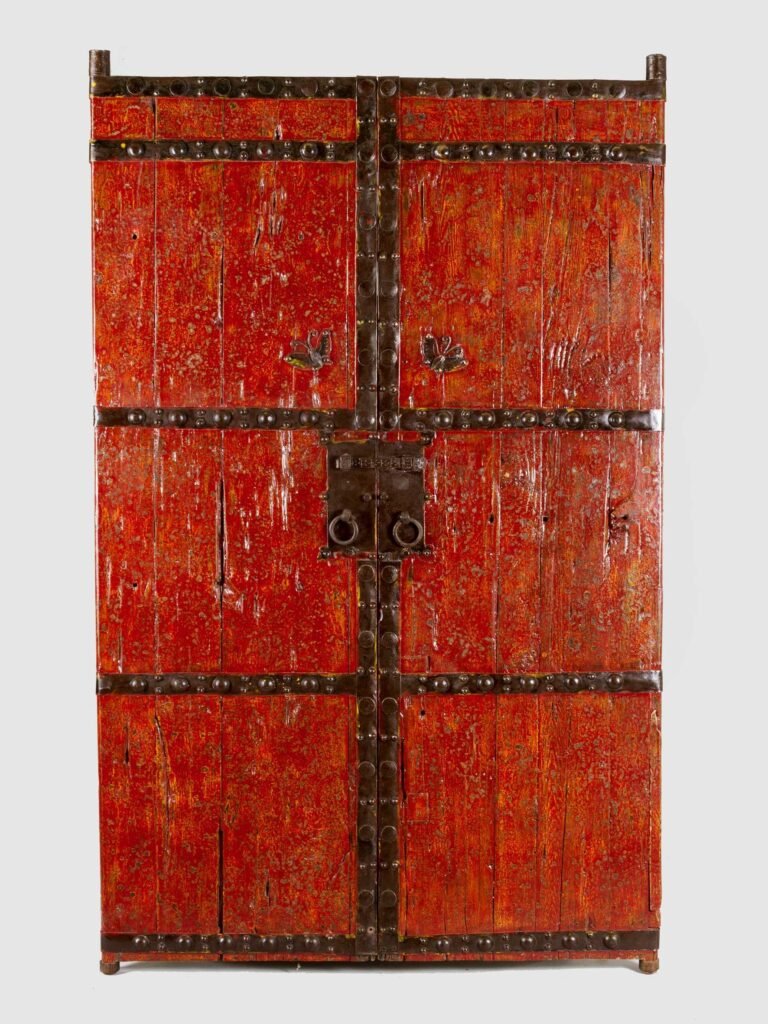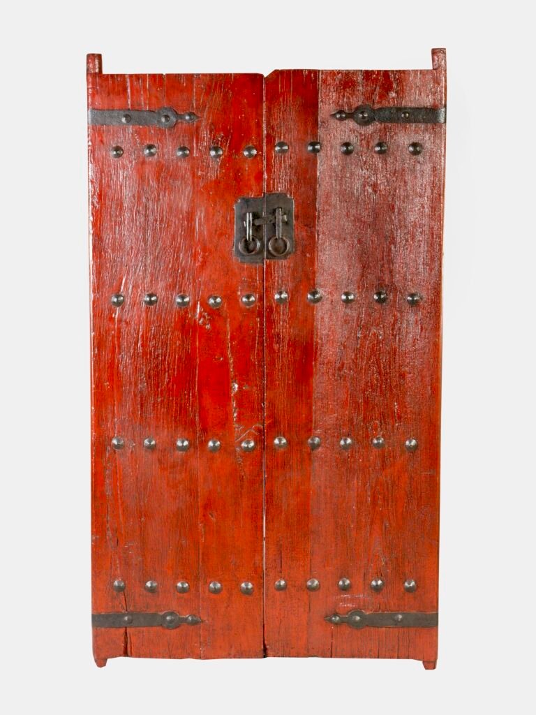 Hartholz mit blutroter Lackfassung, 2 Flügel symmetrisch gegliedert in je 5 Felder, die von geschmiedeten Eisennoppen unterteilt sind, Eisenriegelverschluss und glattes, ausgeschnittenes Verschlussblech, bewegliche Eisenringe, rückwärtiger Holzriegelverschluss, stabile Konstruktion in attraktiver Erhaltung.