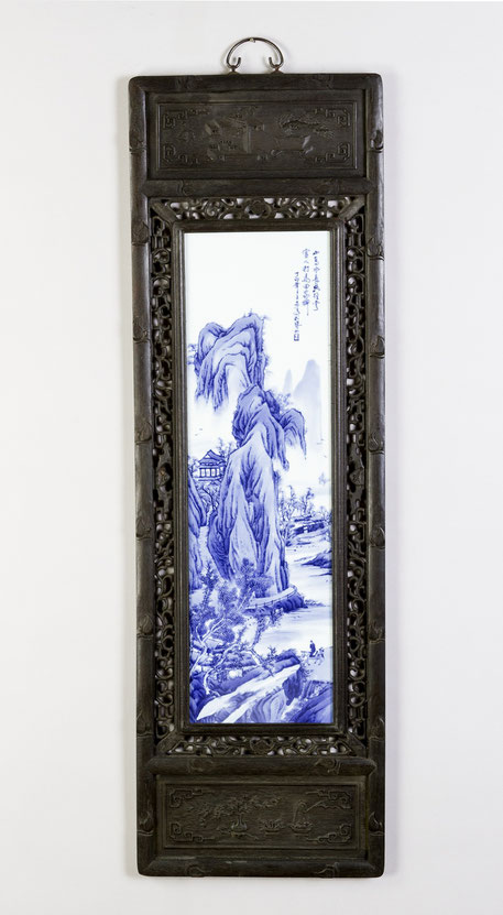 Rechteckiges Porzellanbild im Hochformat, mit blau-weißer Unterglasurmalerei, Kalligraphie und blaues Künstlersiegel, eingefasst von einem durchbrochen gearbeiteten, dunklen Edelholzrahmen.