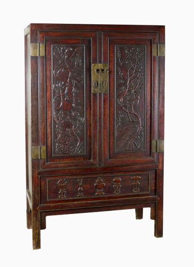 Stabiler Rahmenbau aus dunklem trop. Edelholz, zweiteilig, die Front gegliedert in 2 Türen und 2 Laden mit zarten Reliefschnitzereien, stilisierte Drachen und runde Shou- Glückssymbole, darüber zahlreiche, gestufte Fächer zur Aufnahme von Kuriositäten, Kunstgegenständen und Büchern, die Seitenlänge und Ecken dekorativ mit durchbrochen gearbeitete Ornamenten verziert, glatte Messingbeschläge mit beweglichen, herzförmigen Beschlägen.