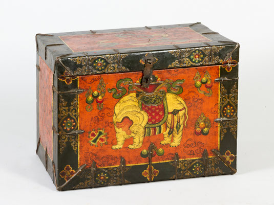 Stabiler Zypressenholzkorpus mit Stoff überfangen und mit polychromer Bemalung, Front mit weißem Elefant, der auf dem Rücken eine Schale mit den Kostbaren Juwelen trägt, auf rotem Grund, Deckel und Seiten mit Ornamenten, Kantenschutz aus Schmiedeeisen, verzierter, beweglicher Verschlussbügel.